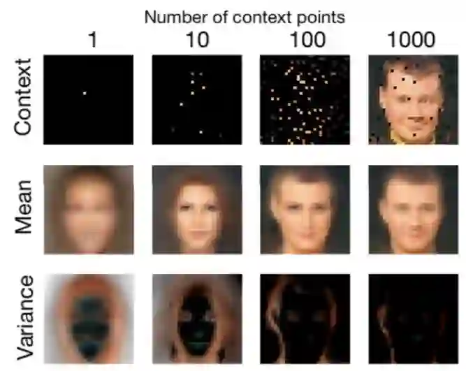 图 4:在 CelebA 上的像素级图像补全。不同观察样本数下的 CelebA 图像回归的两个示例。研究者向模型提供 1、10、100 和 1000 个上下文点(顶行)并查询完整的图像。图中展示了每张图像在每个像素位置得到的平均值(中行)和方差(底行)。