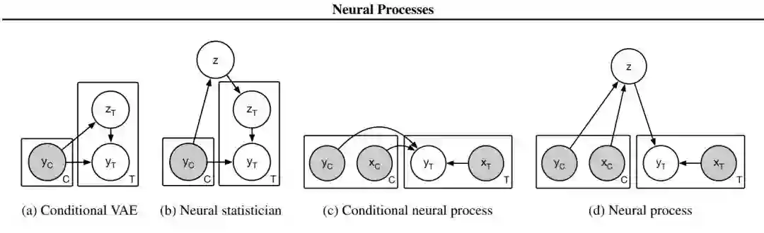 图 2:相关模型(a-c)和神经过程(d)的图模型。灰色阴影表示变量已被观察。C 代表上下文变量,T 代表目标变量(即给定 C 的预测变量)。