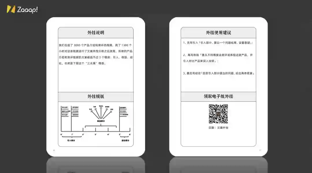 其实也不难,我们在这个手册里,给出了很多个文案模板。这些文案模板都是我们调研了 3000 多个视频,去找他们的共性,总结出来的一个共性模板,所有的视频文案都逃不出这个三段论的内容框架。所以,只要你按照这个框架去展开,你的视频文案内容就是完整的。