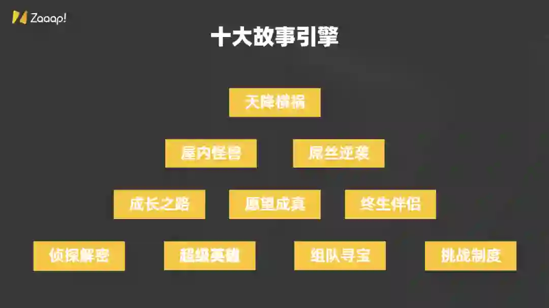 所有的故事,都可以套用这 10 种故事引擎模板,哪 10 种?比如:屋内怪兽、侦探解密、屌丝逆袭、超级英雄、组队寻宝等等等等。