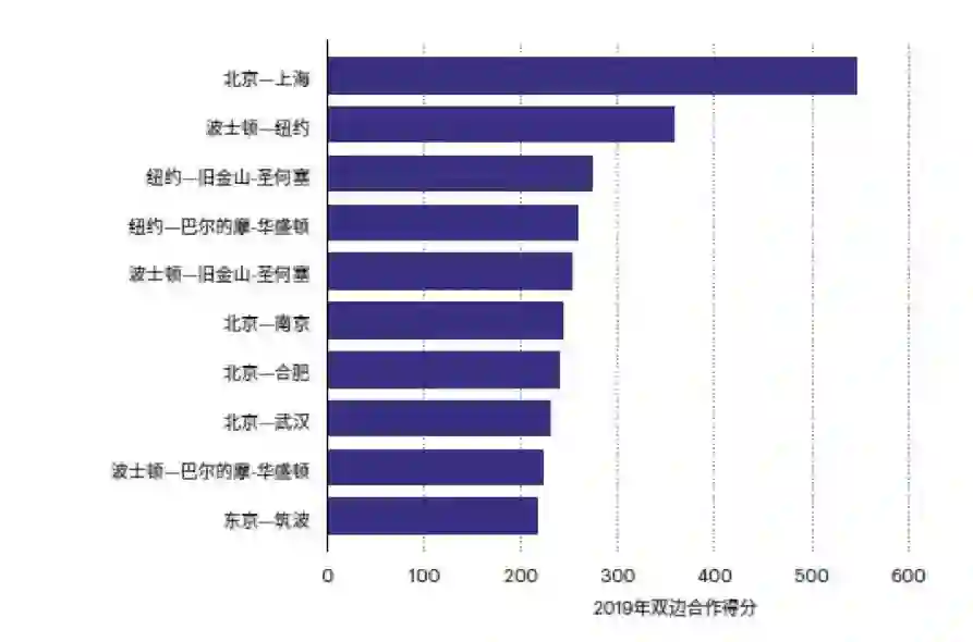 此外,“自然指数-科研城市 2020”排名全球前 5 位的科研城市,其科研合作程度都很高。其中,北京作为中国的全国科技创新中心,与国内外城市形成了密切的科研合作网络,其全球城市间科研合作关系排名进入全球前 10 位,其中北京与上海的科研合作产出位居全球首位。