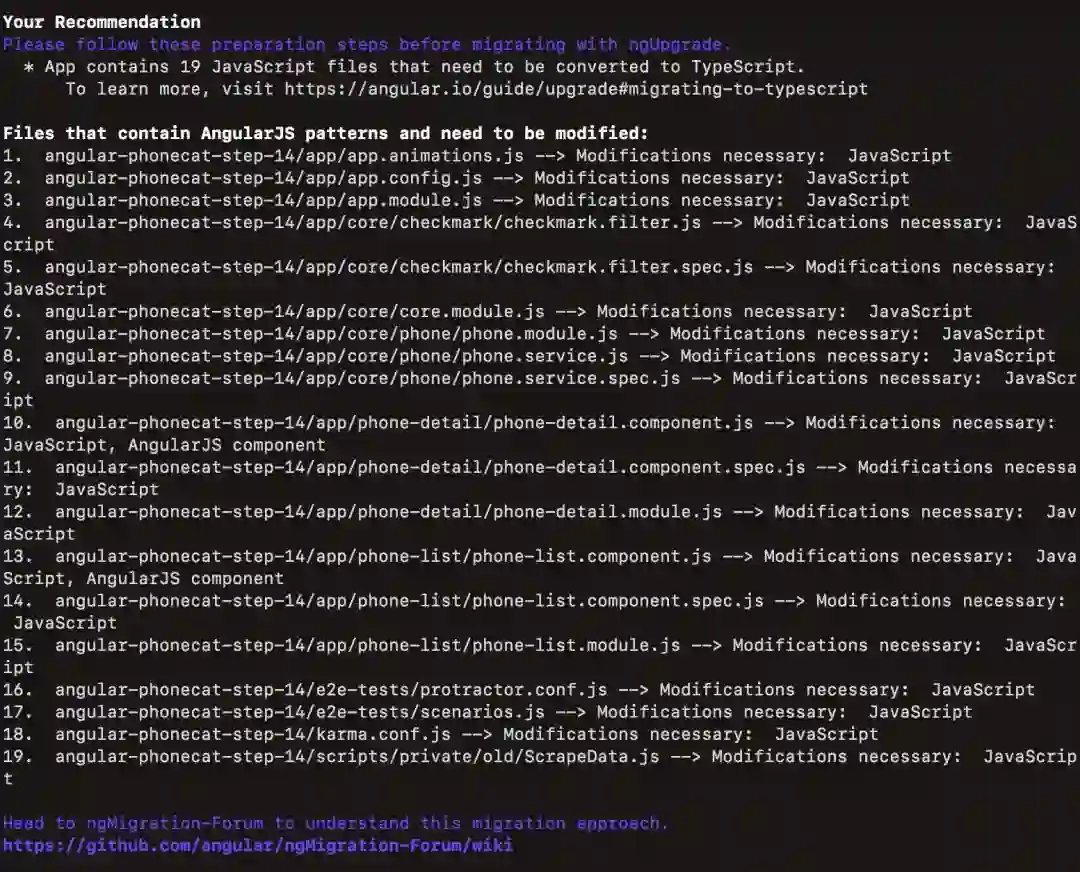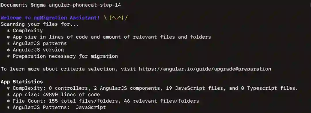 ngMigration Assistant 是一个命令行工具,用于分析 AngularJS 应用程序,并在此基础上,提出迁移路径建议。同时,它还提供应用程序中代码复杂性、大小、构造等方面的统计信息,告诉你迁移之前必要的准备工作。