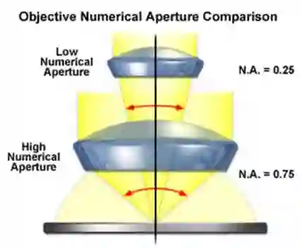 物镜有一个非常关键的参数——数值孔径。NA=nsinθ,n为介质的折射率,而θ则是进光张角的一半,也就是图上红色标注的角的一半。你直接看一张照片时它的分辨率显现不出来,但是你把它放大后就变得模糊,所以高倍镜对分辨率的要求更高,而显微镜的横向分辨率为0.61λ/NA,所以一般来说高倍镜的NA更大。