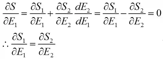孤立系统的熵永不减小,平衡时熵最大。对这个系统来说,S在能量E给定的情况下有极大值。即E是一个常数,因此E2=E-E1。可见E1或E2只要有一个确定,那么另一个就确定了。