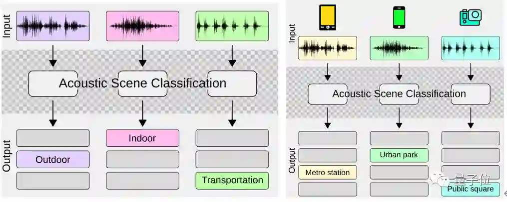 Task 1包含了两个子任务,子任务task 1a的声学场景识别系统要求识别不同终端设备,比如手机、ipad或其它录音设备采集的音频,识别成不同的类别。如下图(左)所示,将不同设备不同场景采集的信号正确分类成“地铁站”、“公园”和“公共广场”。采用不同设备来评估场景识别系统就是为了验证系统对多种设备的鲁棒性。子任务task 1b的声学场景识别系统限制性的将模型大小压缩在500k以内,在此条件下,需要场景识别系统尽可能高效的识别“室内”、“室外”、“交通”这三种常见的声学大场景。这里对声学模型大小提出要求的初衷就是为了更好地将现有科学研究方法迅速转换成可以真正意义的落地产品,以克服设备上运行深度学习网络高CPU消耗的难题。