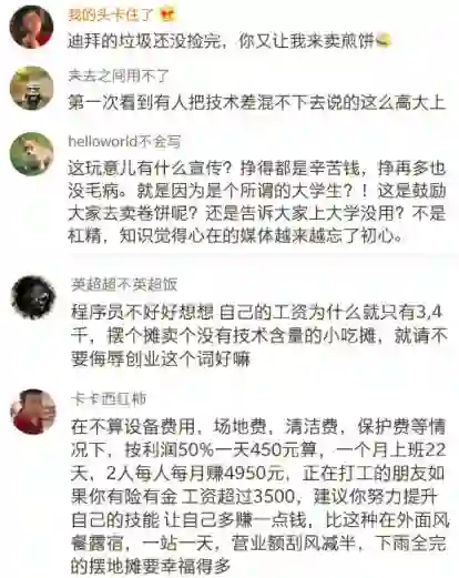 可能短期而言摊饼比敲代码赚钱多;但长期而言,对于刚毕业的他们来说,摊饼很难规模化、公司化,如果是一个具有多年营销和管理经验的人投身此行业,开个连锁倒还有希望。