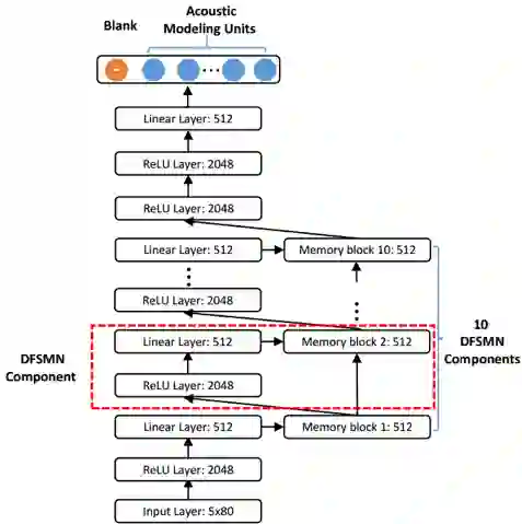 DFSMN(Deep Feedforward Sequential Memory Networks)是研究者之前的工作中提出的一种网络结构,其模型结构如下图所示: