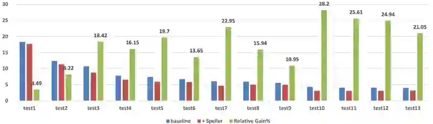 图 4: 基线识别系统和添加了 Speller 的识别系统在不同测试集上的性能对比