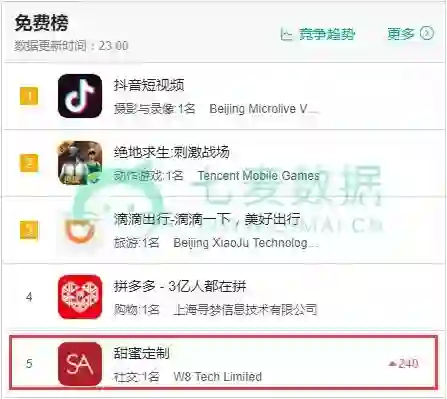 5 月 22 日,一款名叫「甜蜜定制」( Seeking Arrangement ,简称为 SA )的 App 挤掉了社交 4 大红人——「微信」、「QQ」、「探探」、「微博」,直升 765 名,登顶 App Store 社交类应用排行榜,并且挤进总榜 Top 5 。