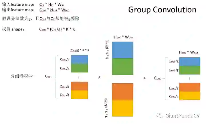 所以看上图,在把输入作im2col操作的时候也是按组来做的,每组 feature map 都会生成一个 的矩阵,然后与对应的权值做乘法,就是图中的相同颜色部分,每组做完乘法就得到了输出feature map,如果还有偏置则是最后再加上,所以分组卷积的运算量就可以求到的了。