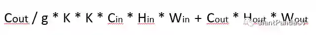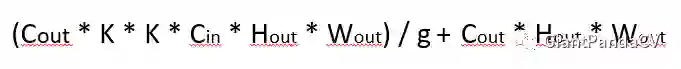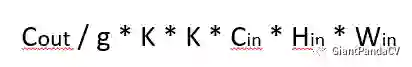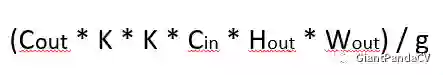 分组卷积的运算量其实就是直接把卷积的运算量除以组数,比如分为g组,继续沿用上面卷积的运算量公式的话,那么分组卷积的运算量为: