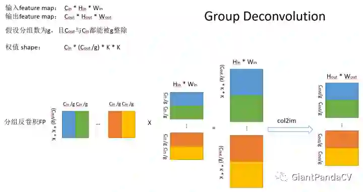 然后在前向过程中,对于每组的计算,权值首先需要转置一下,得到 的权值矩阵然后和输入对应的组数做乘法,然后得到输出对应的组的中间结果,然后每一组的中间结果再通过 col2im 回填到输出 feature map 对应的组的位置。