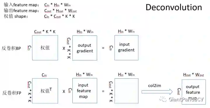 然后我们直接看反卷积的前向操作,和卷积的后向操作对应,权值做转置与输入feature map做一个乘法,这里可以看成是一个 的卷积,输出通道数是 ,然后的到中间结果,然后再做一个col2im的操作回填到输出feature map对应的位置上。所以反卷积的运算量如下: