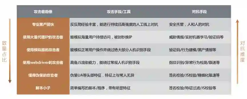 因材施教,对症下药。回到之前对攻击者的分层上来说,我们需要有不同的套路对付不同等级的攻击者。在无数个与线上爬虫对抗的日夜里,我们既见过简单封禁一个IP就搞定的大规模撞库行为,也遇到过具备完善的监控系统和技术人员24小时绕个不停的黑产团伙。从对抗上来说,绝对安全不会被绕过的系统是不存在的,我们能做的就是不断提高攻击者的绕过成本,而这个成本会随着防护层次的丰富指数级上涨。