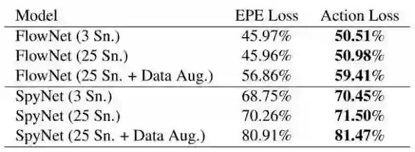 用行为识别分类误差来训练(fine tune)光流比起用EPE误差来能获得更好的行为识别效果。