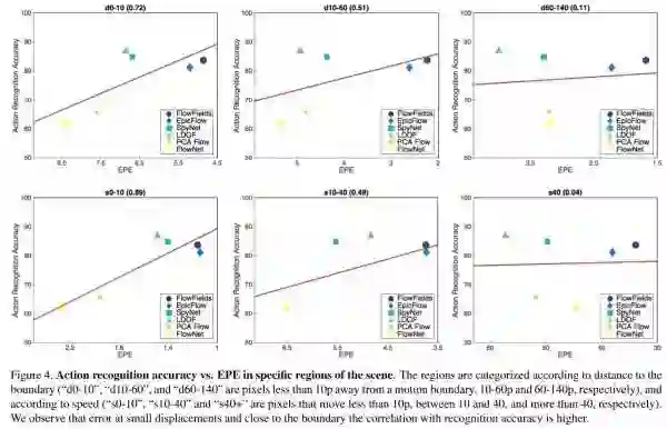 可以看出,两者并没有很强的关联性。并非EPE误差低的光流方法就能获得更好的行为识别精度。进一步,作者探索了光流中的局部区域EPE与动作识别准确率之间的关系,结果如下图所示。