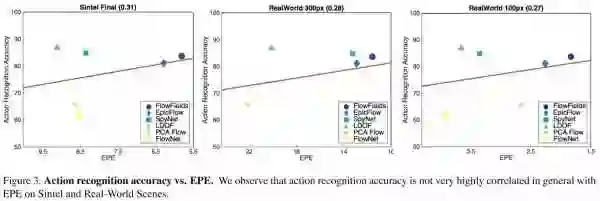 光流算法通常使用终点误差(end-point-error, EPE)来衡量,但EPE的大小与行为识别效果的好坏并没有很强的相关性