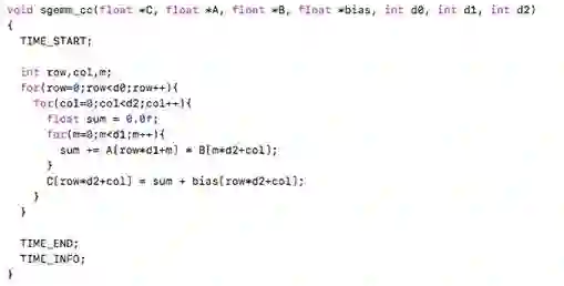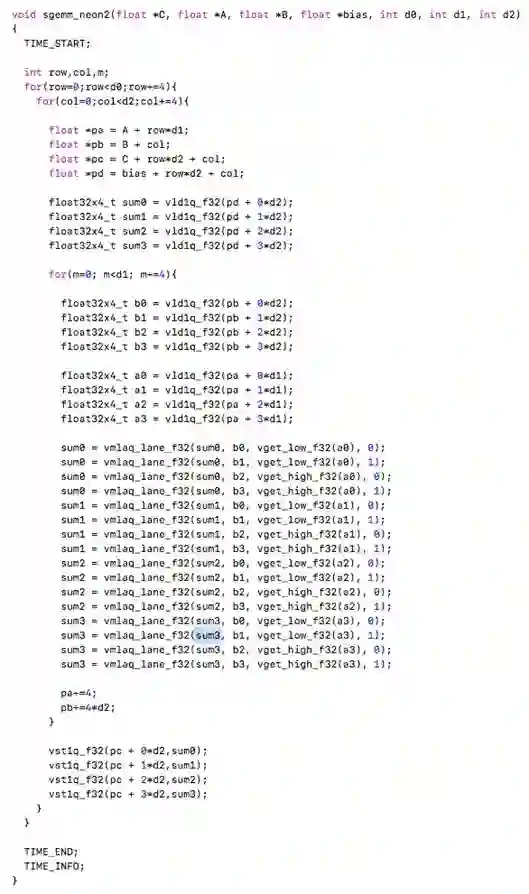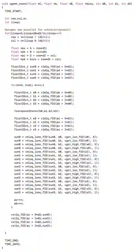 sgemm的优化版本还可以参考nnpack/eigen等开源库。实际代码中,需要处理各种维度的情况,代码远比上述要复杂。