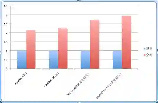 大部分深度神经网络推断引擎,都需要用浮点精度来得到更精确的结果,这样paper上的数据才好看。但实际上,有些DL应用并不需要这么高的精度,即便是单精度浮点,也存在很大的冗余运算。以Tensor的1x1的卷积为例子,实际就是一个乘累加的过程,若使用单精度浮点存放数据,每个元素需要4个字节,而如果将数据量化到8bit, 只需要1个字节,节省3/4的内存访问量,这意味着在带宽紧张的状态下,性能提升会更加明显。下图体现了不同场景下定点化的性能提升收益(倍数)。