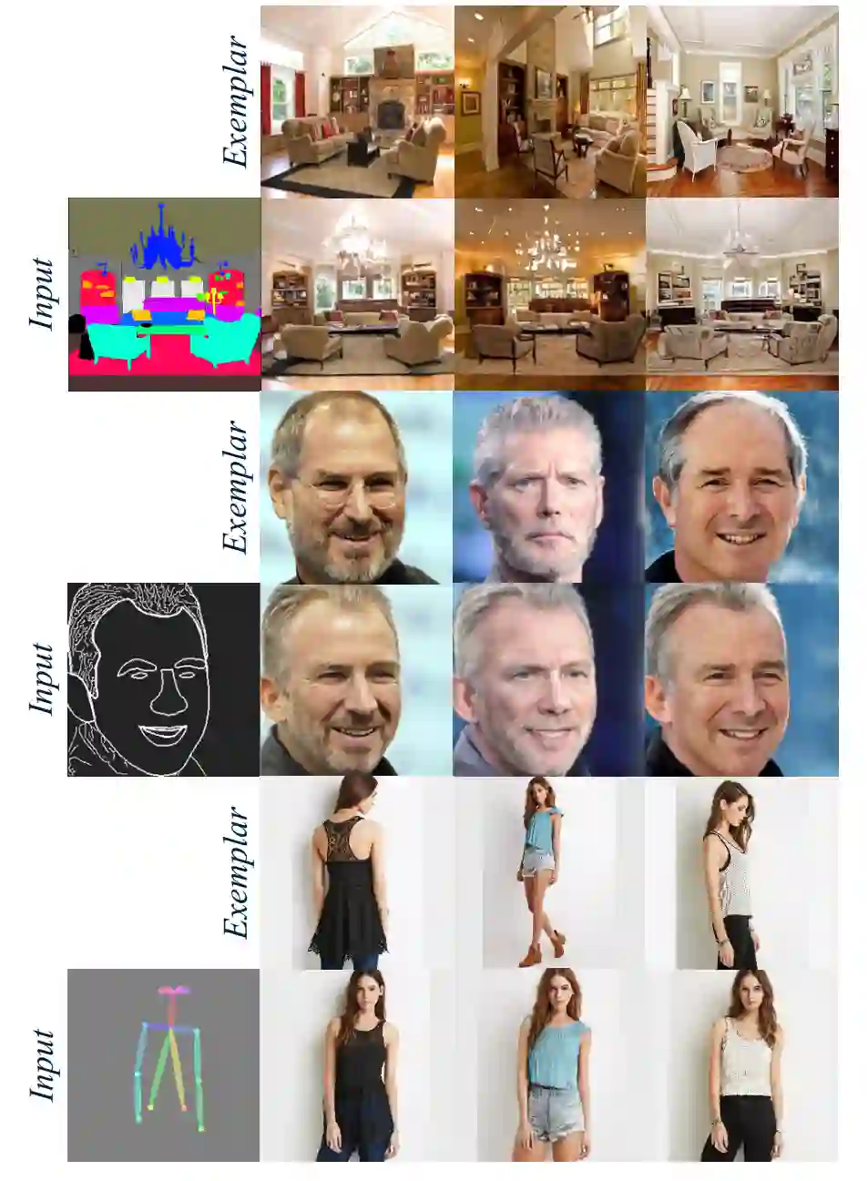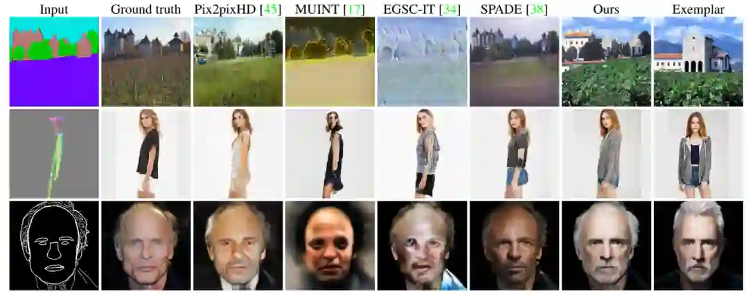 图2:CoCosNet 生成图。我们在三个任务上进行了实验,在语义分割蒙版->场景图像(1-2行)、轮廓->人脸图片(3-4行)、骨骼关键点->姿态图片(5-6行),均取得了迄今为止最高的生成质量。