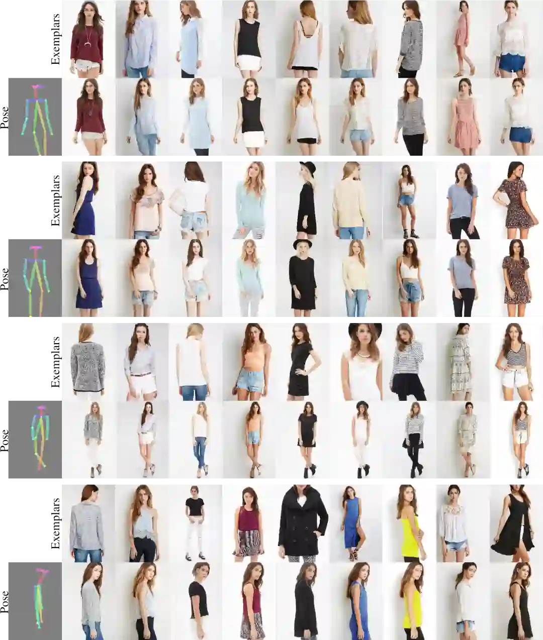 图7:Deepfashion 数据集上姿态关键点->人体姿态图片的图像翻译结果