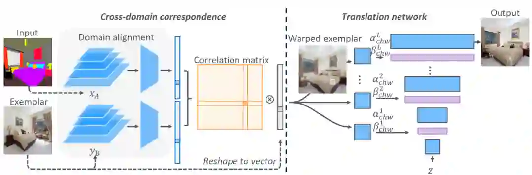 因此,我们提出建立两个域图片(输入图及范例图)之间的密集语义对应(dense correspondence),进而依赖这样的对应,定位输入图在范例中相应位置的颜色、纹理信息,使得生成图片风格精细匹配范例中相同语义的物体(例如,草图的生成结果中,眼睛应该采用范例中的人眼细节)。同时,这样的方法也有助于降低网络学习难度、提高输出图片质量——这是因为网络可以更多地参考范例图中的细节,而无需预测物体的纹理细节。