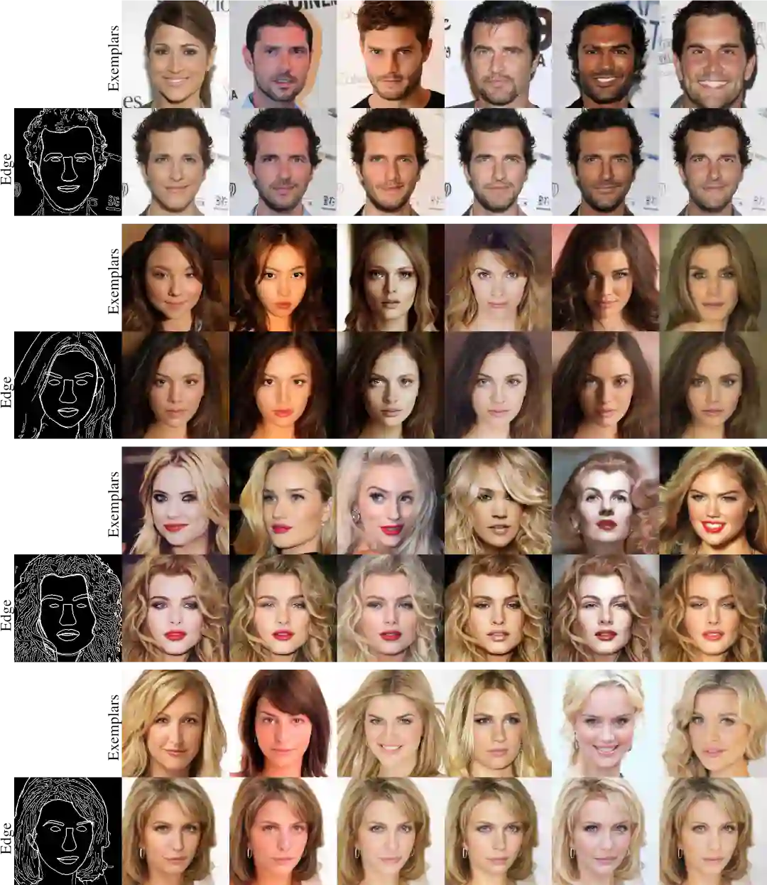 图6:CelebA-HQ 数据集上人脸轮廓->人像图像翻译结果