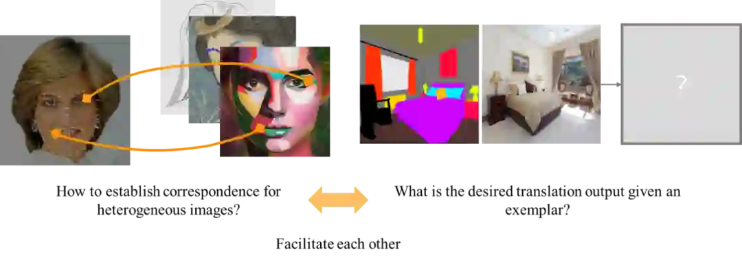 于是,我们的生成任务归结于,如何精准地找到输入及范例之间的语义对应。这里有两大挑战:一是输入图和范例来自不同的域,它们的图像块(image patch)有着巨大的图片域差异(domain gap),因而我们无法用某种预先定义的距离指标(如颜色的欧氏距离)直接对应两类图片的图像块;另一方面,我们很难取得这样的标注信息,即不同域图片之间的语义对应,来作为网络训练的监督信息。如图1,建立自然人脸与油画人像之间的密集对应,事实上是困难的,而这样的跨域语义对应(cross-domain semantic correspondence)问题也是首次被提出。