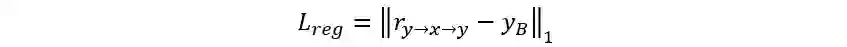 当输入 x_A 与 y_B 时,我们有理由相信,他们同样被适应到共有空间中,该空间保留了两张图片的语义特征。我们可以在这个特征空间中算两张图两两位置间的相似度矩阵 M,其中矩阵元素 M(u,v) 表示 x_A(u) 与 y_B(v) 之间的语义相似性。这个相似度矩阵也可以理解为注意力机制,因而 x_A 的对应点实际上是 y_B 中每个点的加权和,其权重取决于他们之间的语义相似度。因此,如果学习得当,我们将得到变形的 y_B(记为 r_(y→x),也就是图3中的 warped exemplar),该图与输入 x_A 语义对齐。这里,我们引入一个对应关系正则项,要求 r_(y→x) 经过反向形变后可以重建范例图片: