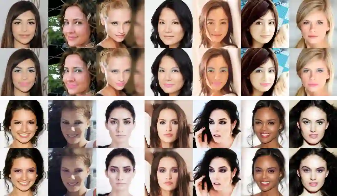 这一方法还可以用于人像批量上妆。用户可以选择在给定的一张人像用 PS 上妆,这个上妆过程往往是笔刷涂抹,利用人像之间的对应关系,我们可以批量将笔刷应用到其他人像上。下图中我们为一批图片加上烟熏妆。第一列为手工 PS,后面几列均为算法迁移结果。鉴于程序员审美与 PS 技术有限,相信专业人士能用我们的算法得到更出众的结果。
