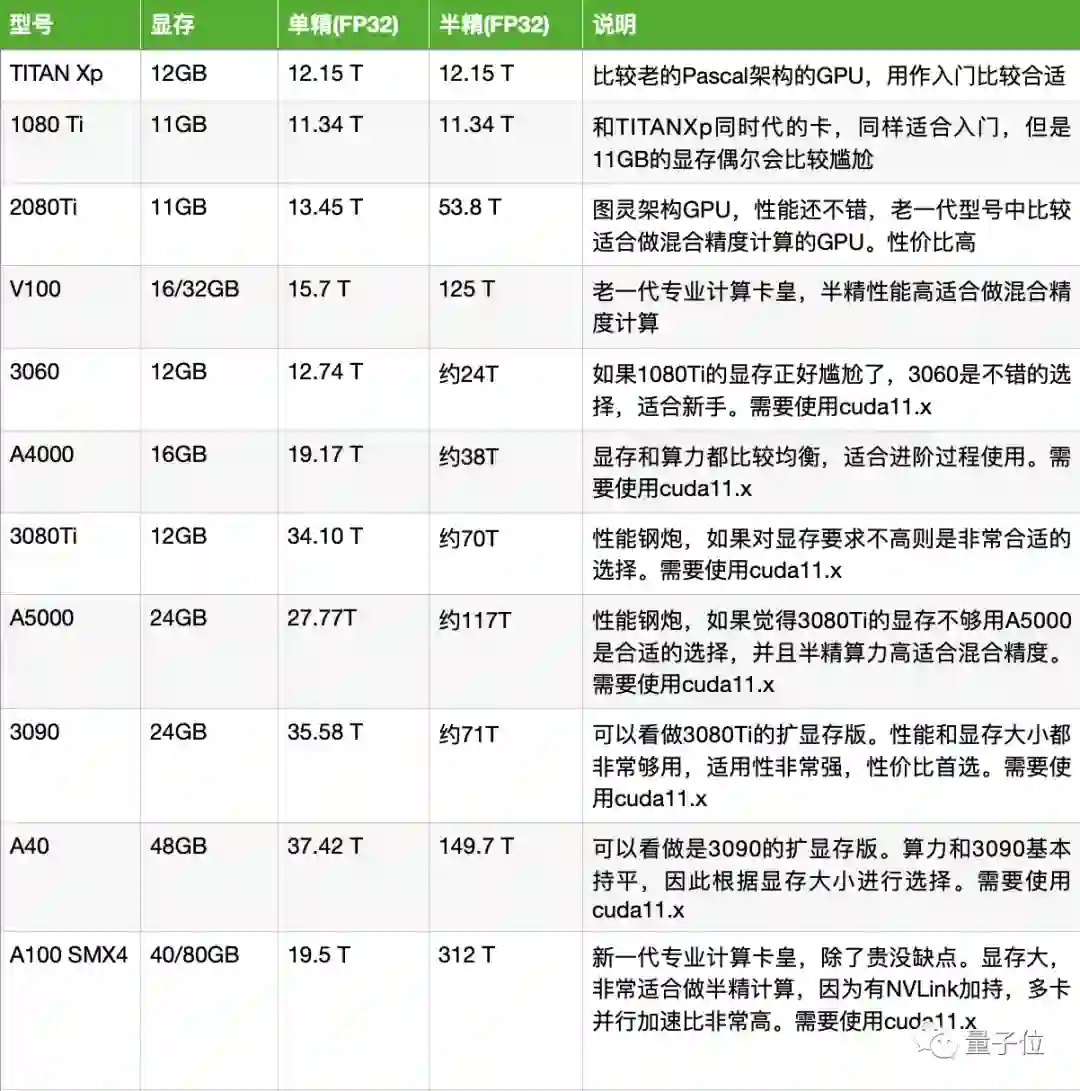 最后,再附上一份各GPU型号简介供参考,看看你的模型适合跑在什么卡上。