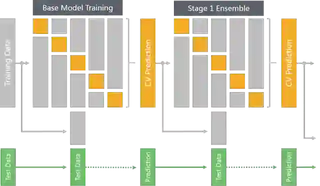 图5展示了使用 5-Fold 进行一次 Stacking 的过程(当然在其上可以再叠加 Stage 2, Stage 3 等)。其主要的步骤如下: