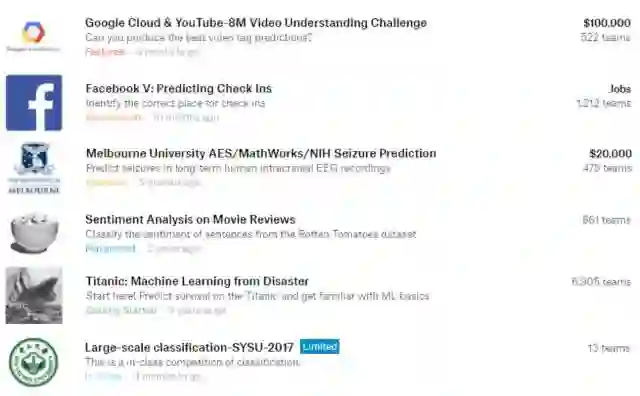 Kaggle 于 2010 年创立,专注数据科学,机器学习竞赛的举办,是全球最大的数据科学社区和数据竞赛平台。在 Kaggle 上,企业或者研究机构发布商业和科研难题,悬赏吸引全球的数据科学家,通过众包的方式解决建模问题。而参赛者可以接触到丰富的真实数据,解决实际问题,角逐名次,赢取奖金。诸如 Google,Facebook,Microsoft 等知名科技公司均在 Kaggle 上面举办过数据挖掘比赛。2017年3月,Kaggle 被 Google CloudNext 收购。