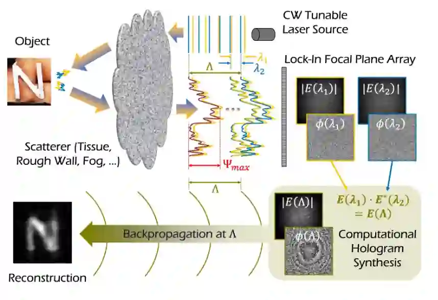 这种被称为合成波长全息术(synthetic wavelength holography)的新方法是通过将相干光间接散射到隐藏的物体上,然后光在这些物体再次散射并传播回相机。
