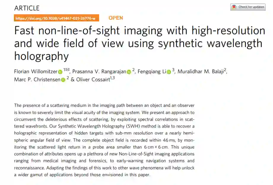 与相关的非视线成像技术相比,西北大学的方法能够以亚毫米精度快速捕获大面积的全场图像。