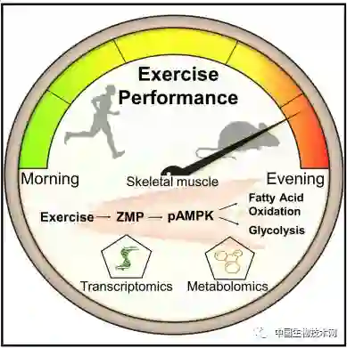 为了确定运动表现在一天之中变化的潜在决定因素,他们在小鼠肌肉组织上应用了高通量转录组和代谢组学方法。研究人员发现,在“小鼠的夜晚”中,运动产生的一种名为ZMP(5-氨基咪唑-4甲酰胺核苷酸)的代谢物水平更高。已知ZMP通过激活AMPK来激活与糖酵解和脂肪酸氧化有关的代谢途径,AMPK是细胞代谢的主要调节因子,因此,它可能有助于提高晚间的运动能力。Asher说:“有趣的是,ZMP是AICAR(氨基咪唑甲酰胺核苷)的一种内源性类似物,AICAR是一些运动员用于兴奋剂的化合物”