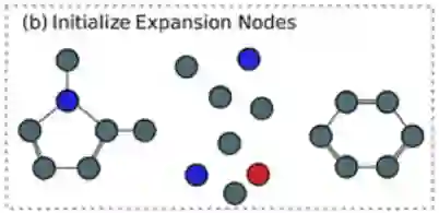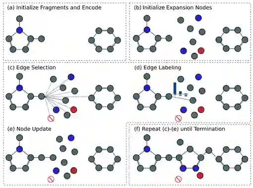 生成过程概览:原始片段(a)通过逐个键的迭代扩展(c-e)来产生分子,包括两个片段(f)原子由图中的节点表示,节点的颜色代表不同的原子类型,而键由边表示,单键、双键和三键的边类型不同