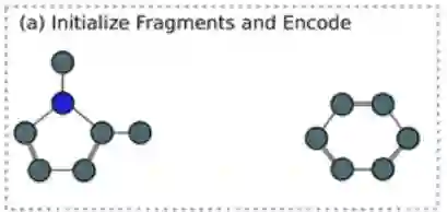 生成过程以广度优先的方式建立分子键。生成由两个片段或子结构初始化。这些片段或子结构将与提供子结构之间的距离和角度的结构信息连接在一起。片段被转换为图表示,其中原子和键分别由节点和边表示。每个节点都与隐藏状态z和标签L相关联,表示节点的原子类型。该图通过一个编码器网络,一个标准的门控图神经网络(GGNN),并且被更新的节点的隐藏状态合并它们的局部环境中。
