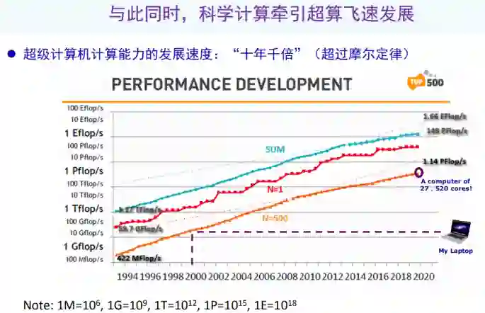 在科学计算巨大需求的牵引之下,超级计算机的计算性能按照“十年千倍”的速度迅猛攀升。我们都知道摩尔定律,摩尔定律的是说个人计算机的性能提升速度是每18到24个月性能翻一番,而超级计算机可以达到每年性能翻一番,“十年千倍”的发展速度。