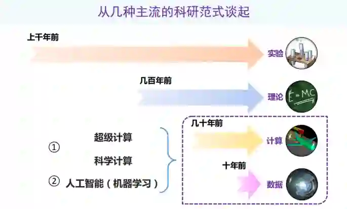 从主流的科研范式来看,认识世界发现世界的三种最主要的科研手段是实验、理论和计算,最近十来年随着数据科学的兴起,基于数据的科学发现被认为是第四种重要的科研范式。而围绕计算和数据有三个非常独立但又相互关联很大的方向,超级计算、科学计算和人工智能。