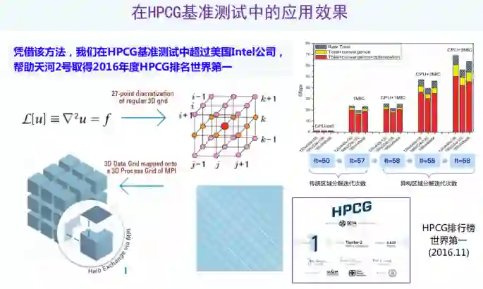 虽然理论上很难分析这种异构区域分解算法的收敛性,但是在实际应用中,这种算法达到很好的应用效果。HPCG是基于偏微分方程求解的高性能计算机的排名标准,我们把这个算法应用于HPCG优化里,取得了很好的效果,收敛性非常好,帮助天河2号拿到2016年的HPCG世界排名第一。