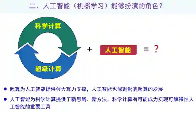 的报告。在报告中杨老师介绍到:科学计算和超级计算之间相互促进、共同发展的闭环已经形成了几十年了,人工智能近年巨大的成功为科学计算带来了新思路、新方法、新工具,而科学计算的严谨体系则有助于提升现有人工智能技术的可解释性。