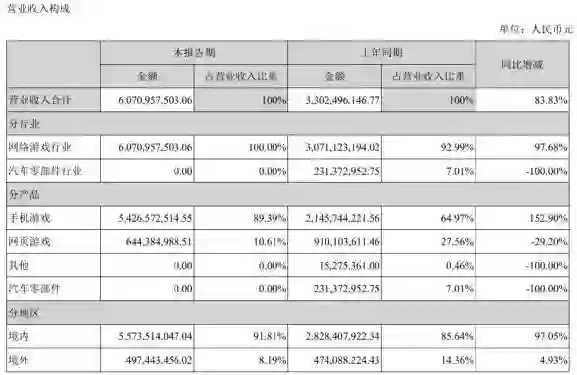 业绩增长的主要原因为手机游戏业务收入在2019上半年实现152.9%的增长,取得54.27亿元的收入,占总营收的89.39%。