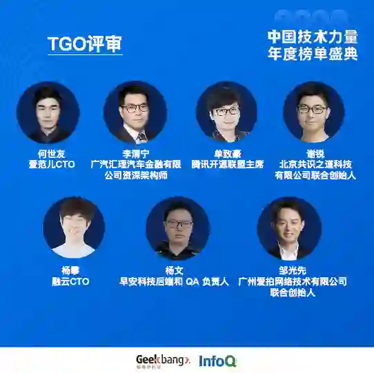 TGO 评审团成员包括:何世友,爱范儿 CTO;李渭宁,广汽汇理汽车金融有限公司资深架构师;单致豪,腾讯开源联盟主席;谢锐,北京共识之道科技有限公司联合创始人;杨攀,融云 CTO;杨文,早安科技后端和 QA 负责人;邹光先,广州爱拍网络技术有限公司联合创始人。(按姓氏拼音排序)