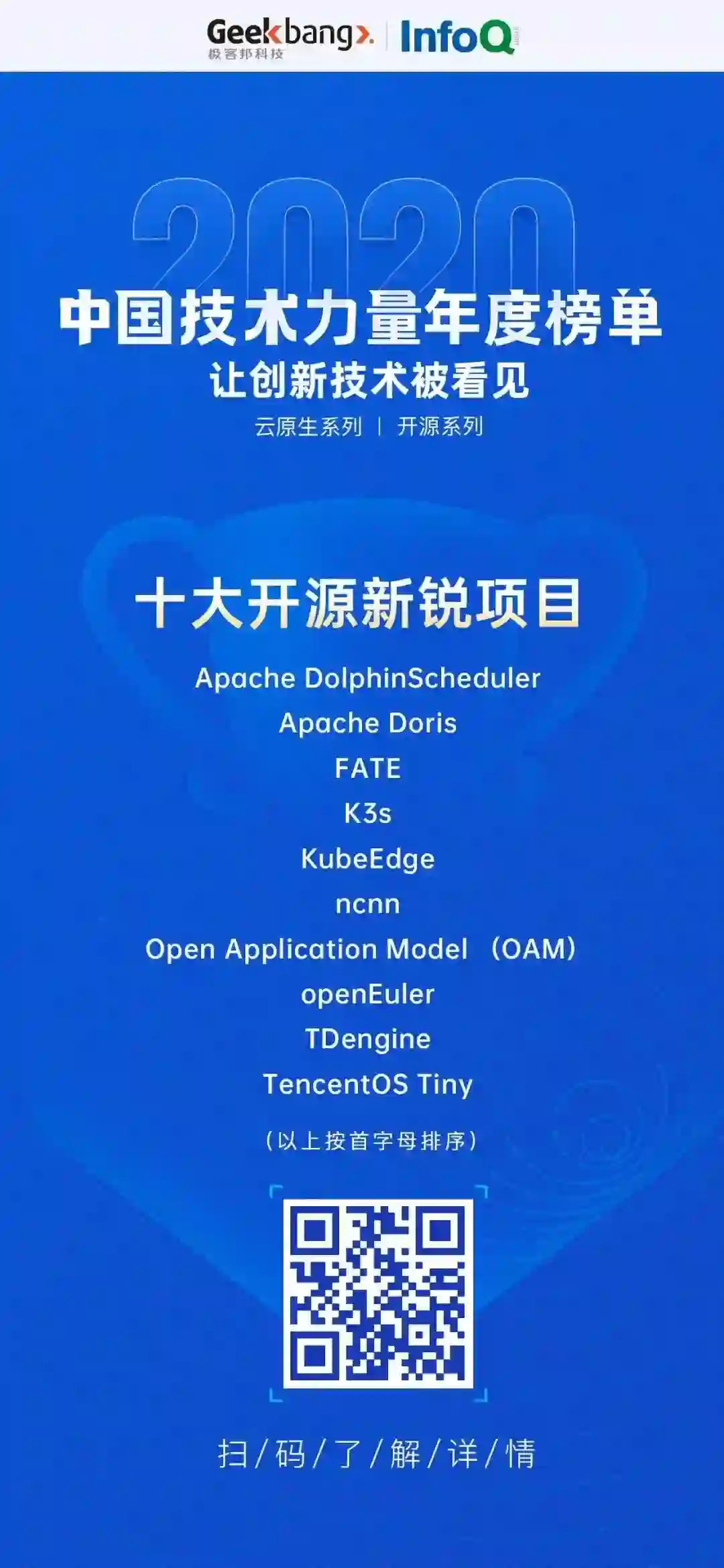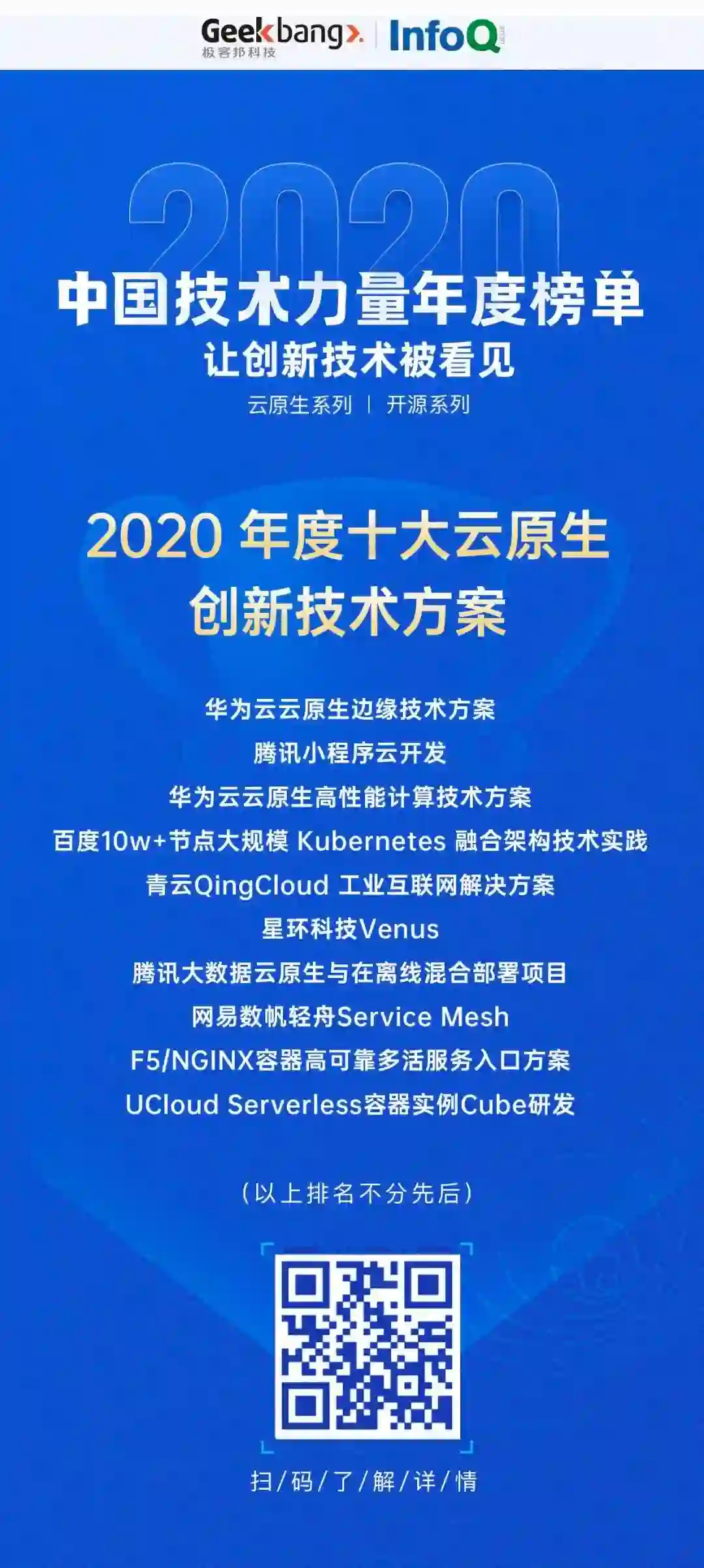 【InfoQ 2020 中国技术力量年度榜单评选】是 InfoQ 作为第三方独立媒体,创立 13 年来首次推出的榜单类活动,秉承“提供可信赖的内容”核心价值观,对本次征集评选严格把控流程、建立统一标准,借助规模庞大的专家团队、编辑团队和开发者社区对参评项目进行多维度评价。