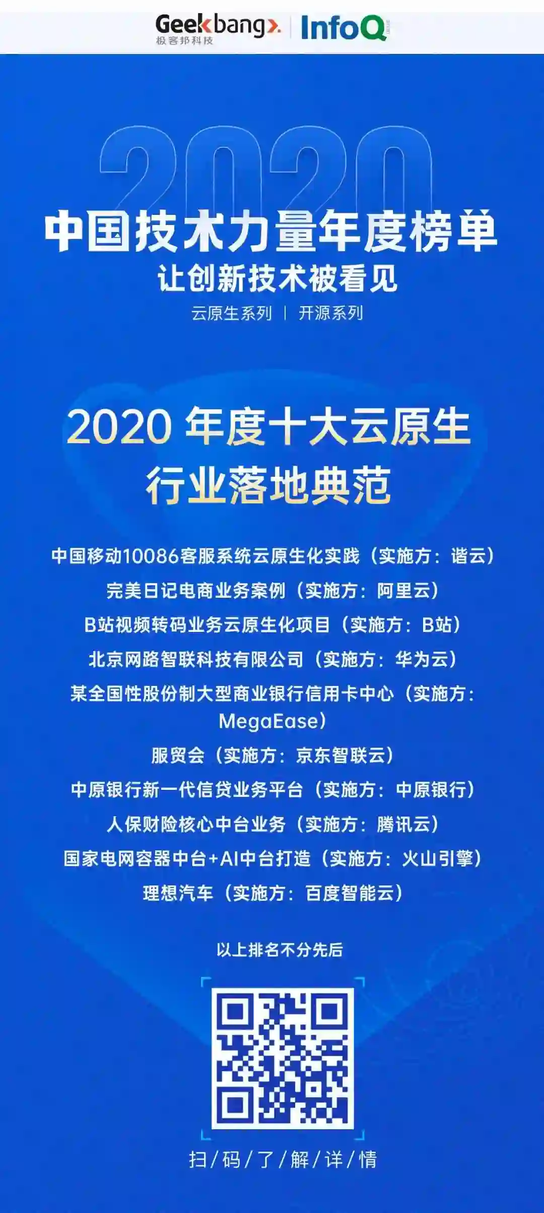 中国移动 10086 客服系统云原生化实践(实施方:谐云);完美日记电商业务案例(实施方:阿里云);B 站视频转码业务云原生化实践(实施方:B 站);北京网路智联科技有限公司(实施方:华为云);某全国性股份制大型商业银行信用卡中心(实施方:MegaEase);2020 年服贸会数字平台(实施方:京东智联云);中原银行新一代信贷业务平台(实施方:中原银行);人保财险核心中台业务(实施方:腾讯云);国家电网容器中台 +AI 中台打造(实施方:火山引擎);理想汽车容器基础设施云原生化实践(实施方:百度智能云)。(排名不分先后)