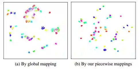 图 4:全局映射和分段映射生成的类别分类器利用 t-SNE [21] 得到的二维可视化结果。每个点表示一个生成的分类器,不同的颜色表示不同的类别。每个类别显示五十个分类器,每个分类器都是通过学习随机抽样的五个范例获得的。该可视化基于 CUB Birds 数据集。