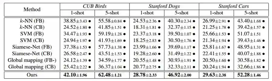 具体而言,我们的网络由双线性特征学习模块和分类器映射模块组成:前者将示例图像的分类信息编码为特征向量,后者将中间特征映射到新类别的决策边界。模型的新颖之处在于分类器映射模块中的「分段映射」功能,该功能通过一种参数更少的方式学习一组相对易实现的子分类器,进而生成决策边界。基于辅助数据集我们用元学习的方式学习范例到分类器的映射,它可以泛化至新类别中。我们在三个细粒度基准数据集上进行了相关测试,实验结果表明,我们的 FSFG 模型显著优于其他方法。