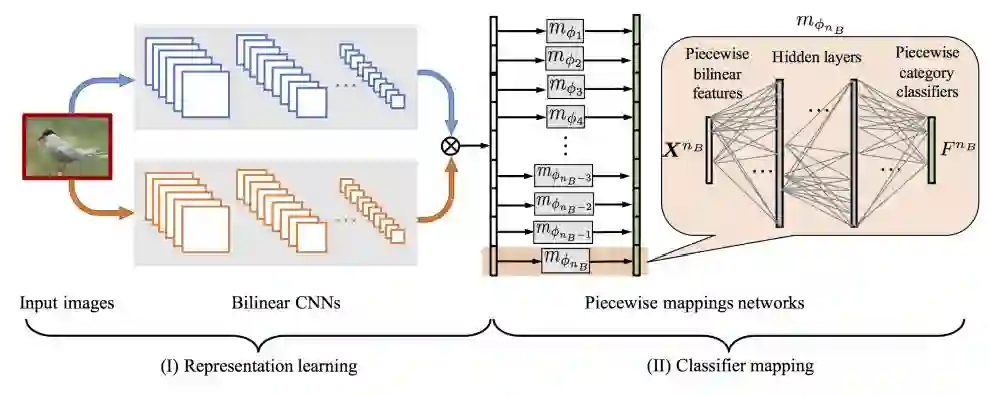 设计了一种名为分段映射的新型范例到分类器映射方法,它采用双线性 CNN 特征的特殊结构,利用相对较少的参数学习得到分类器。