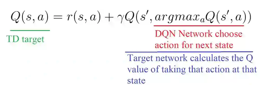 解决方案是:当我们计算Q目标时,我们使用两个网络将动作选择与目标Q值生成分离: